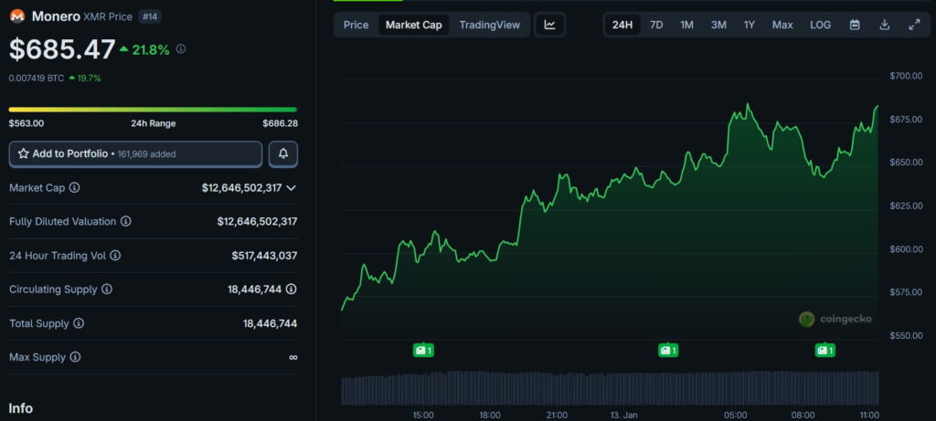 Los datos de CoinGecko muestran que XMR rompió durante horas de la madrugada del martes (hora Nueva York) una altura sin precedente de USD $687, alcanzando una capitalización de mercado de USD $12,6 mil millones.